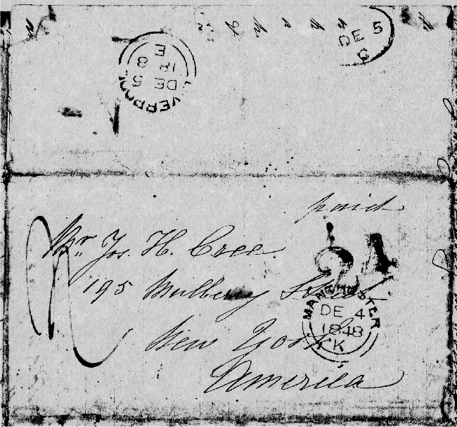 Introduction:The Letters:1. 1844: This letter was written to Joseph and Martha by Joseph's mother Elizebeth (Cutts) Cree a couple of months after they left England. 2. 1846: This letter to Joseph is from William Greaves, a friend he had known back home and who was now living in Philadelphia. 3. 1848: This letter to the whole family is from Joseph's mother Elizabeth. 4. 1852: From Thomas Jefferson Cree of Wheelock, Vermont, to Joseph Cree replying to a letter from Joseph enquiring whether they might be related. 5. 1853: To Joseph and Martha from Joseph's sister Rebecca Cree. There is also a note from Joe's mother Elizebeth Cree 6. 1856: To Joseph from his sister Rebecca Cree. There are also letters from his mother Elizabeth and his nephew William Frisby. 7. c1864: To Joseph from Robert Hogbin, a friend he had known in New York. 8. 1870: To Joseph from his son-in-law Chris Hodsdon in Fremont, Iowa. 9. 1870: From Joseph to Mary and Chris Hodsdon, his daughter and son-in-law in Fremont, Iowa 10. 1870: From Chris Hodsdon to his wife Mary, who was visiting her father Joseph in Pompey, New York State. Postscript: What happened afterwards | Next page | |