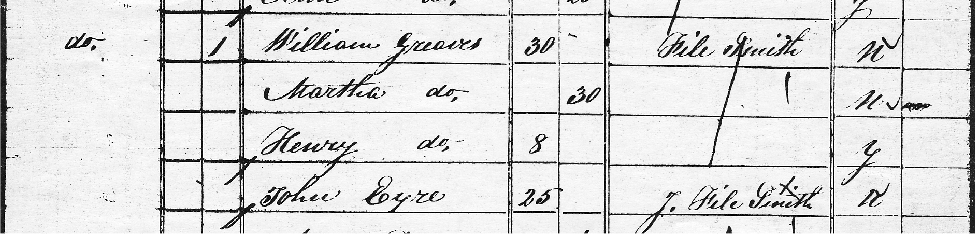 John Eyre was Martha Greaves's brother and was shown in the 1841 Census return for Swanwick as a journeyman filesmith living in William and Martha's household. See the facsimile below. |